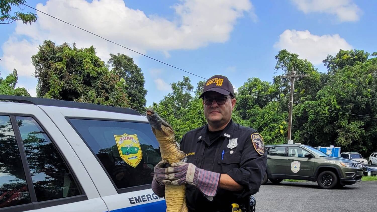 Agentes adscritos al División de Rescate de Fuerzas Unidas de Rápida Acción, fueron alertados, en la mañana de hoy, sobre un caimán en la vía de rodaje frente al concesionario de autos Mazda, en la Avenida John F. Kennedy, en Santurce.