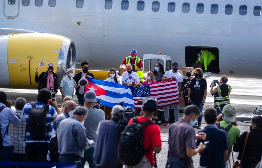 Junto con la carga llegaron varios activistas -entre ellos Benjamin- que desplegaron una bandera cubana y otra estadounidense al tiempo que cajas de cartón bajaban de las bodegas de la nave, constató The Associated Press.