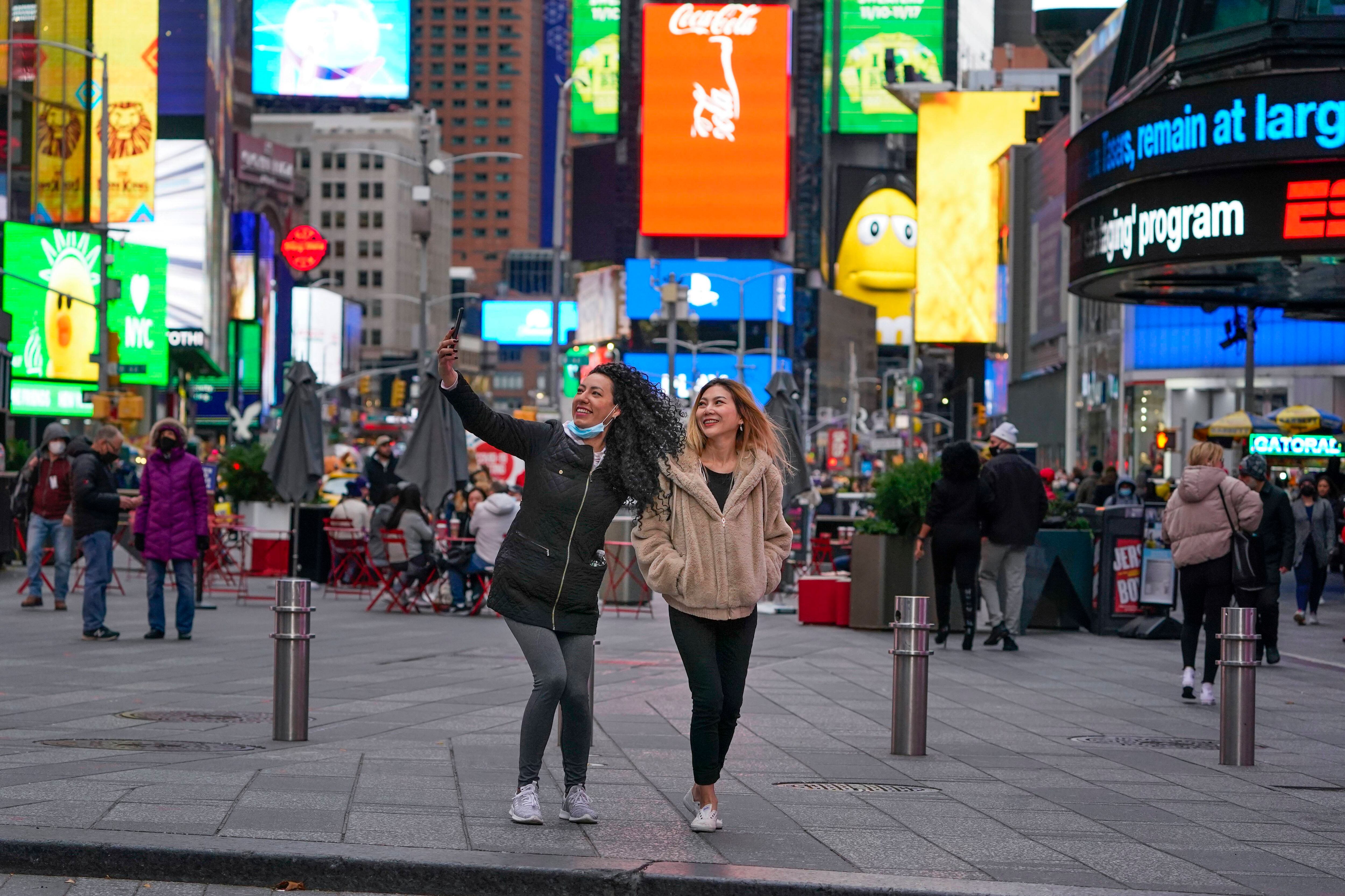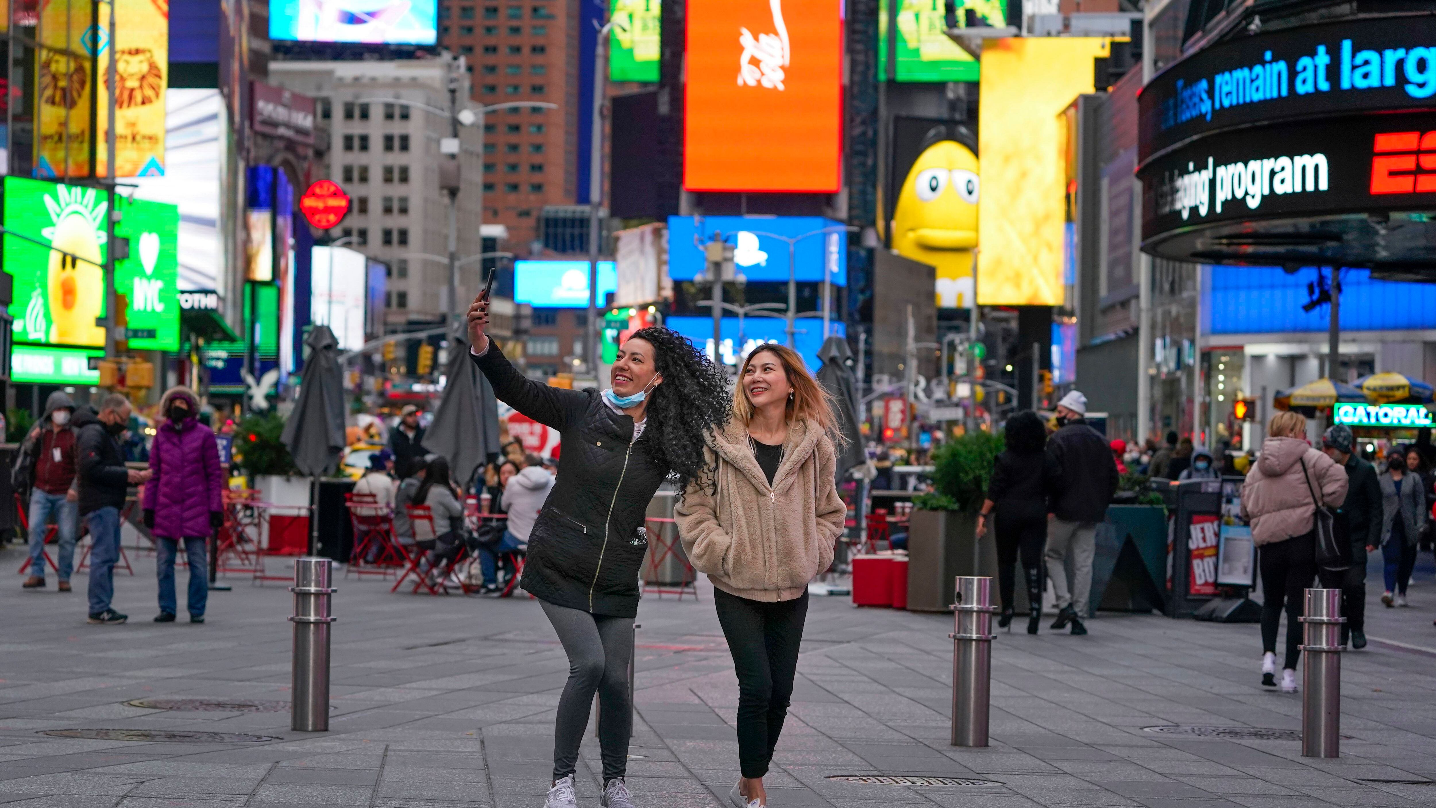 Entre los turistas que regresan están personas como Marina Galán, que miraba Times Square desde las gradas bajo una cascada de luces. Ella y sus amigos viajaron a Nueva York desde Madrid en el primer día que las fronteras estadounidenses fueron reabiertas a los extranjeros vacunados.