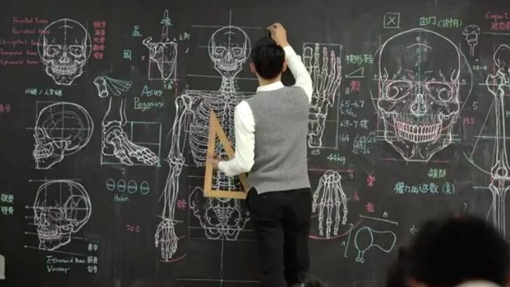 El profesor Chuan-Bin Chung fue grabado el 9 de diciembre dibujando intrincados dibujos del cuerpo humano durante su clase en el Colegio Médico de Xiamen en Taiwan.