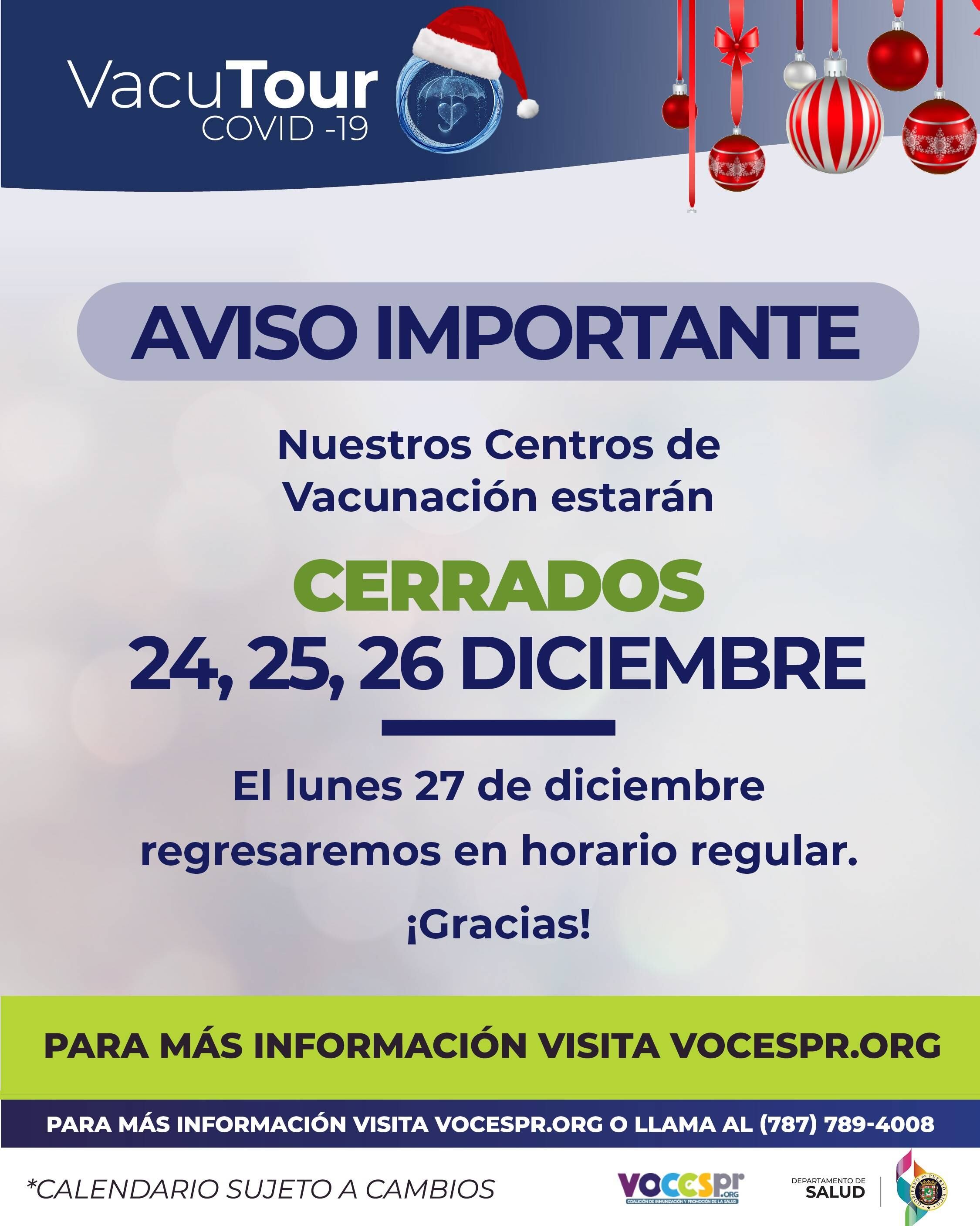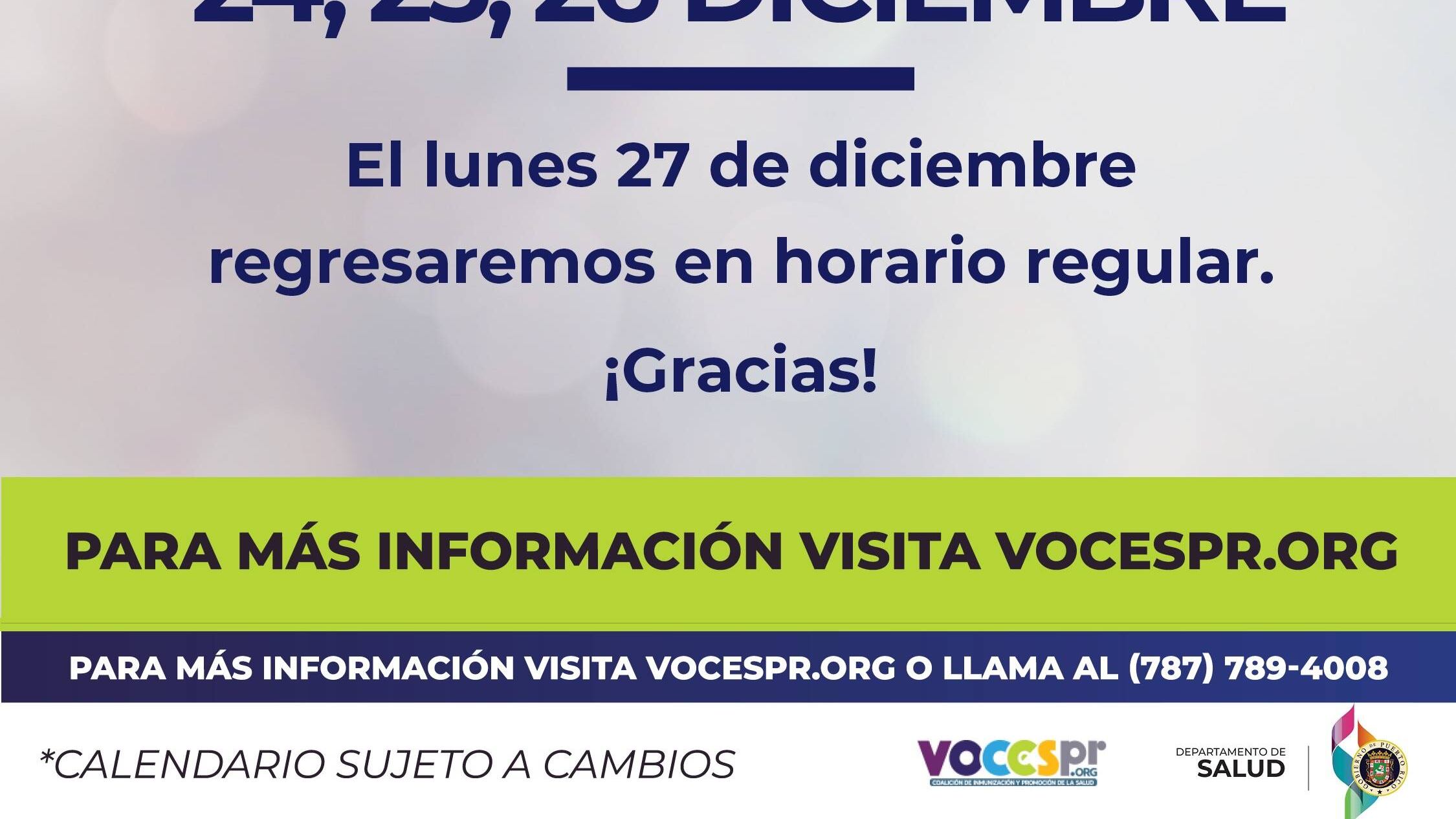 Los centros de vacunación de La Coalición de Inmunización y Promoción de la Salud de Puerto Rico (VOCES) permanecerán cerrados hoy, mañana sábado y el domingo como parte del receso navideño. Así lo informó la organización en su cuenta de Twitter.