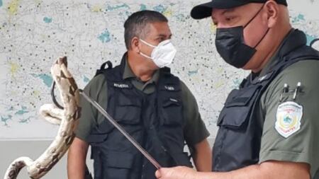 “Personal del Cuerpo de Vigilantes, captura boa constrictor en el área de Jardines de Campo Rico en San Juan. Para reportar la venta ilegal de especies o si tiene una especie exótica y no sabe que hacer con la misma, comuníquese con el Cuerpo de Vigilantes al (787) 724-5700”, tuiteó la cuenta oficial del DRNA.