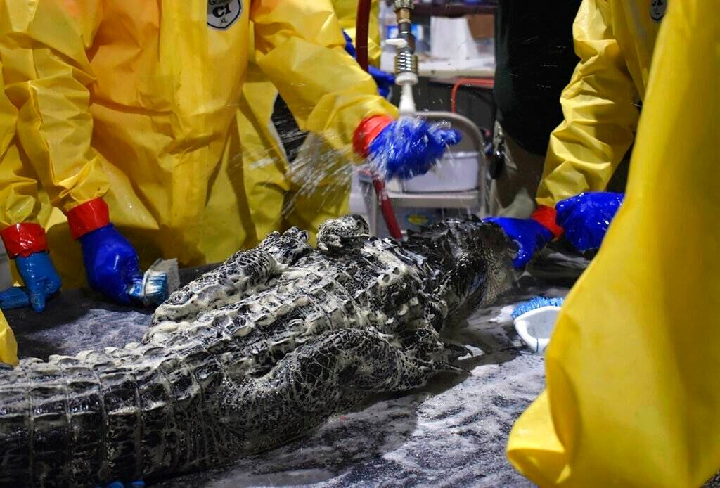 Para limpiar un caimán de dos metros de largo el jueves se necesitaron ocho personas: cuatro sujetadores, dos frotadores, una persona con una manguera para enjuagar con agua caliente y otra para cambiar el agua de lavado, dijo Laura Carver, que se convirtió en coordinadora de derrames de petróleo del departamento en febrero de 2010, menos de tres meses antes de un enorme derrame de petróleo de BP en el Golfo de México frente a las costas de Luisiana.