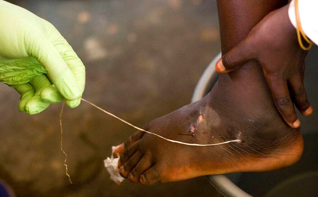 El gusano de Guinea es un parásito que puede crecer dentro de las personas que beben agua que no es potable. Los gusanos llegan a crecer hasta 1 metro (3 pies) de largo antes de salir dolorosamente de la piel.