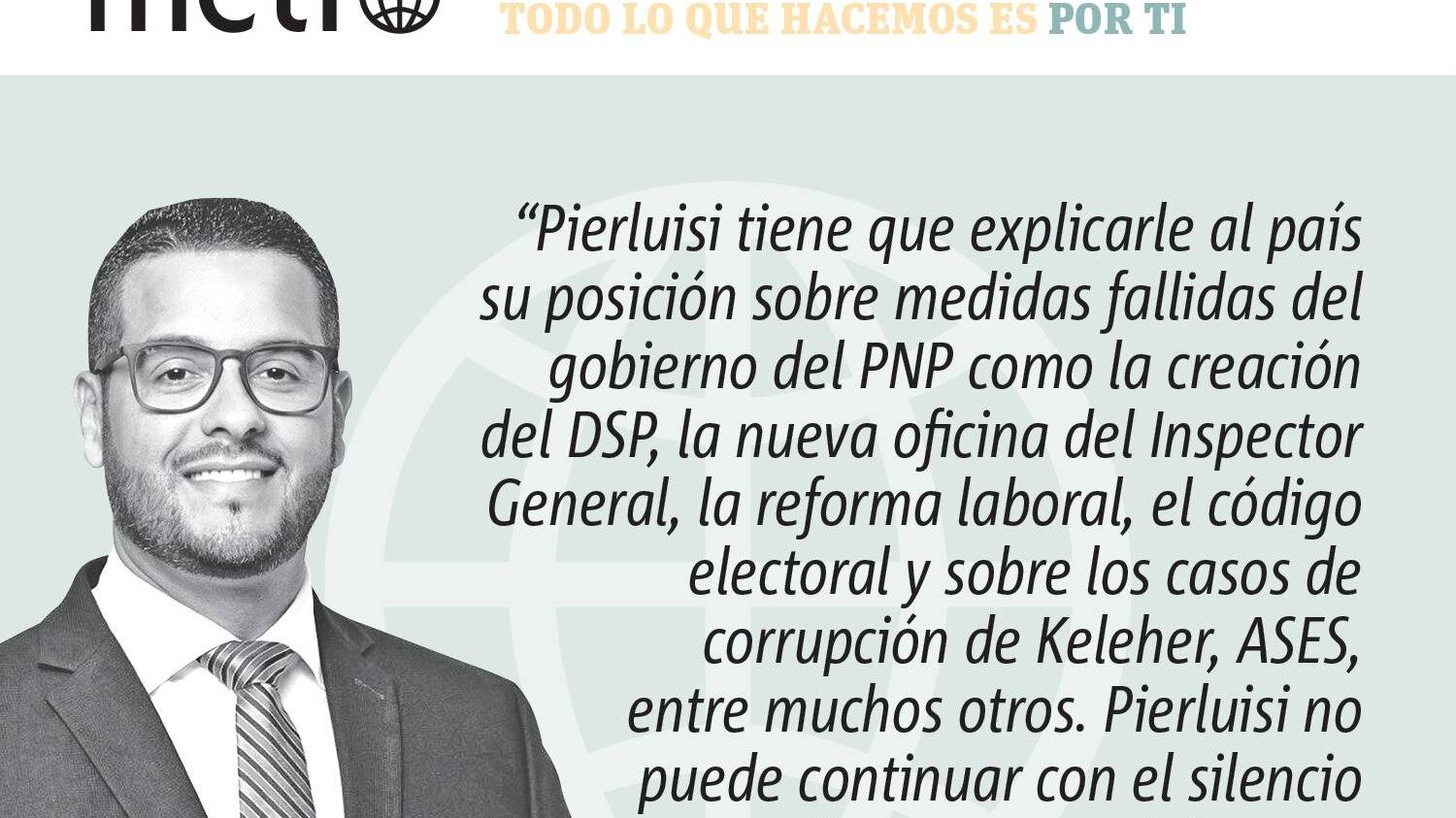 Durante este cuatrienio se han señalado conflictos de intereses en contrataciones en la AEE y el país no conoce la posición del candidato Pierluisi. Igual con los recortes a los municipios, UPR y organizaciones sin fines de lucro, auspiciados por la Junta y el gobierno del PNP. Pierluisi tiene que explicarle al país su posición sobre medidas fallidas del gobierno del PNP como la creación del DSP, la nueva oficina del Inspector General, la reforma laboral, el código electoral y sobre los casos de corrupción de Keleher, ASES, entre muchos otros. Pierluisi no puede continuar con el silencio complice en torno al desastre que su partido ha provocado este cuatrienio. ¿Asumirá su responsabilidad o al igual que la Comisionada Residente va a negar a sus correligionarios de esta administración?