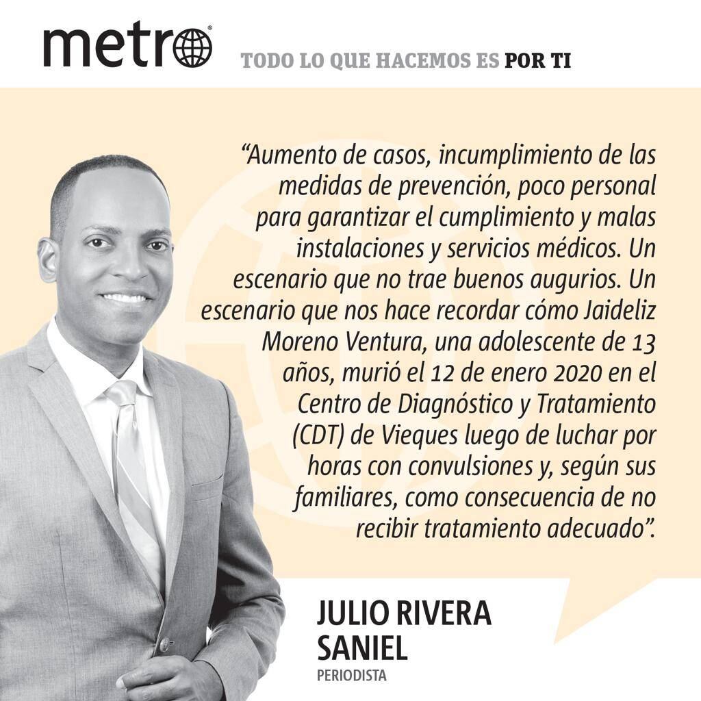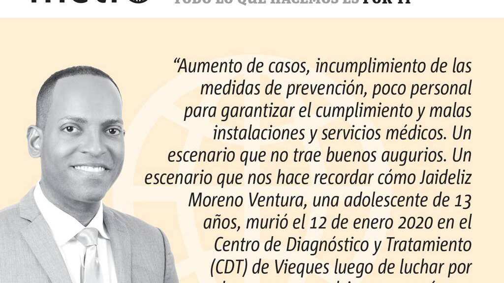 En fin. Aumento de casos, incumplimiento de las medidas de prevención, poco personal para garantizar el cumplimiento y malas instalaciones y servicios médicos. Un escenario que no trae buenos augurios. Un escenario que nos hace recordar cómo Jaideliz Moreno Ventura, una adolescente de 13 años, murió el 12 de enero 2020 en el Centro de Diagnóstico y Tratamiento (CDT) de Vieques luego de luchar por horas con convulsiones y , según sus familiares, como consecuencia de no recibir tratamiento adecuado.