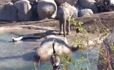 En las imágenes se observa al elefante lanzándole agua al pato que se encuentra al otro lado de una especia de río artificial. Sin embargo, el pato no se mueve ni da señal de terror. Cuando el elefante le da la espaldas a este pato, el ave vuela hacia su lomo como una seña de enfrentamiento.