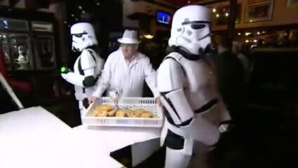Así llegaban los pasteles a este pequeño bar de Manchester, escoltados por Stormtroopers de Star Wars. Están hechos de vacuno y papas y el que primero termine con uno de ellos, se alza como ganador. Todos ellos han intentado tragar lo más rápido posible, y se lo toman muy en serio. El ganador se devoró su pastel en tan sólo 32 segundos, aunque asegura que no ha entrenado, que para él es un día más en la oficina. Video: Reuters.