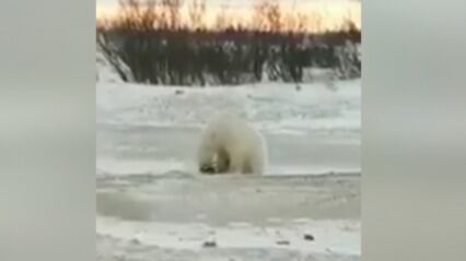 Las imágenes fueron captadas en Manitoba, Cánada y se alcanza a ver al oso manotear al perrito que está rodando en la nieve.