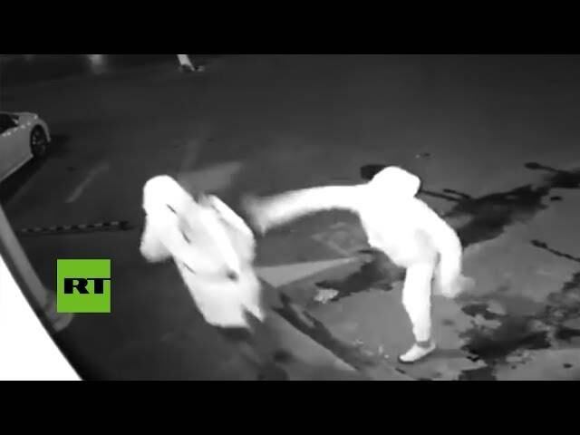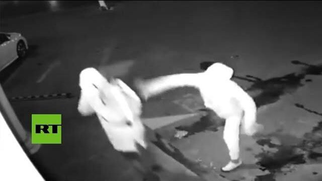 En el clip se muestran a dos individuos acercándose a un establecimiento con la intención de romper el escaparate y asaltarlo.