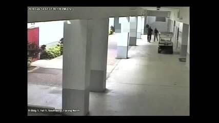 Las imágenes lo muestran a él y a un miembro del personal acercándose con prisa hacia el edificio. Peterson saca su arma y toma posición fuera del edificio.