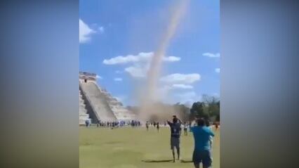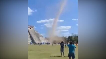 Sin embargo, no esperaban que el cambio de estación llegara acompañado de un impresionante tornado que se focalizó en el sector de la pirámide de Kukulcán, sorprendiendo a los visitantes.