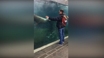 El video mágico, filmado el 12 de marzo, muestra a un hombre parado al lado del tanque del león marino, y el león marino que intenta seguir los movimientos de su mano derecha mientras lo mueve en círculos sobre el vidrio.