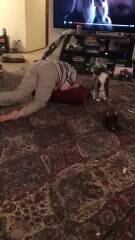 Al ver esto, la mascota se acerca y roza su cabeza contra la de él y comienza a darle lengüetazos. Ante esto, el pequeño se calma y comienza a acariciar al felino, que se acurruca para facilitarle la tarea.