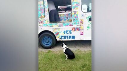 Y cuando el camión se detiene, se apresura hacia la ventana, se para sobre sus patas traseras y espera a que el servidor tome su dólar a cambio de su bola de helado favorita.