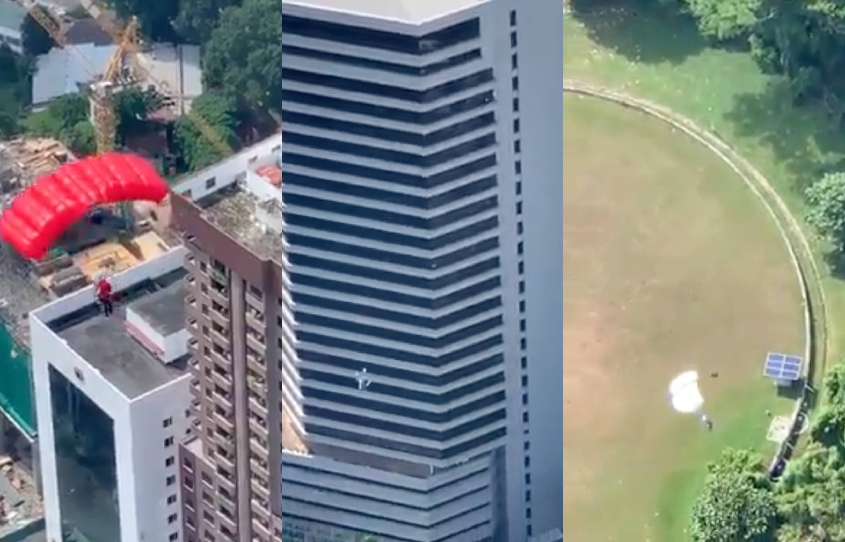 Las imágenes compartidas hace unas horas, muestran cómo dos sujetos se lanzan desde un edificio y comienzan a maniobrar por la ciudad, pero por un error desconocido, uno de ellos resbala y comienza a caer dando varias piruetas involuntarias por los aires, hasta que gracias a su rápida acción logra activar el equipo de emergencia y así evitar una muerte segura.