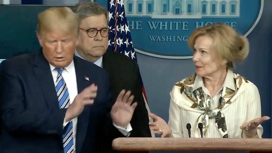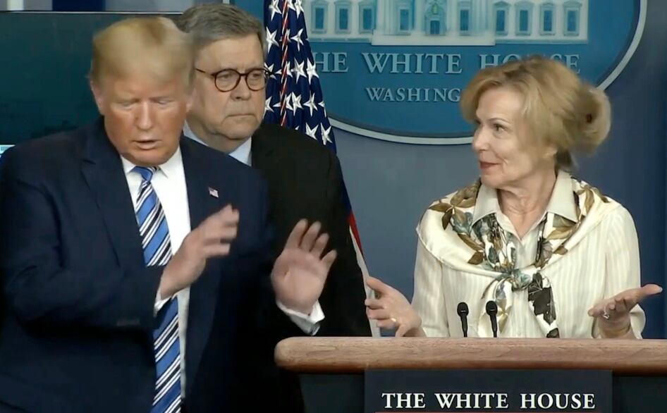 “El sábado tuve algo de fiebre” mencionó Deborah Birx, coordinadora del grupo de trabajo sobre coronavirus, a lo que inmediatamente Trump interrumpió: “Oh no” y se alejó rápidamente de su colaboradora.