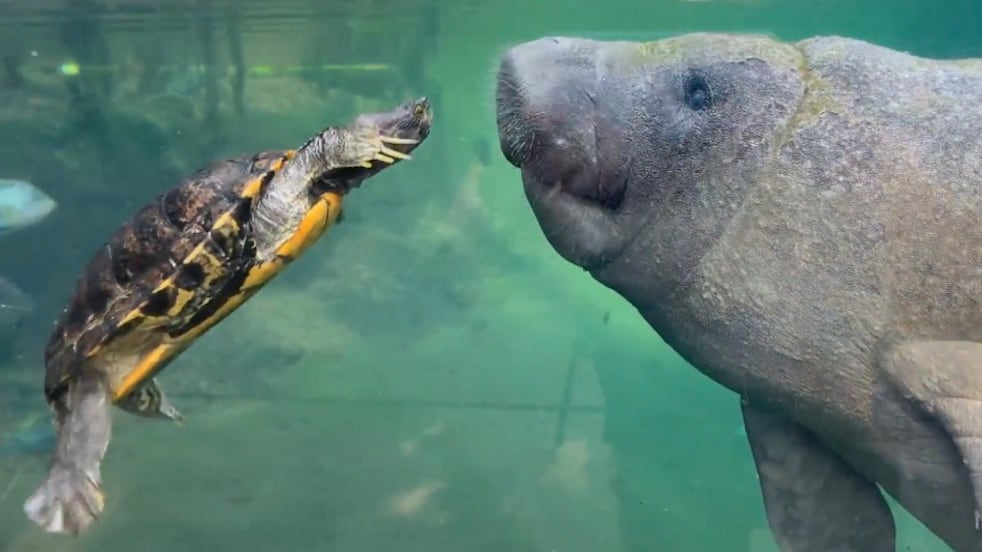 En un acto de camaradería entre animales de diferentes especies, una tortuga deslizante de orejas rojas y un manatí caribeño fueron grabados jugando en un tanque de acuario en el zoológico Royal Burgers en Arnhem el viernes.