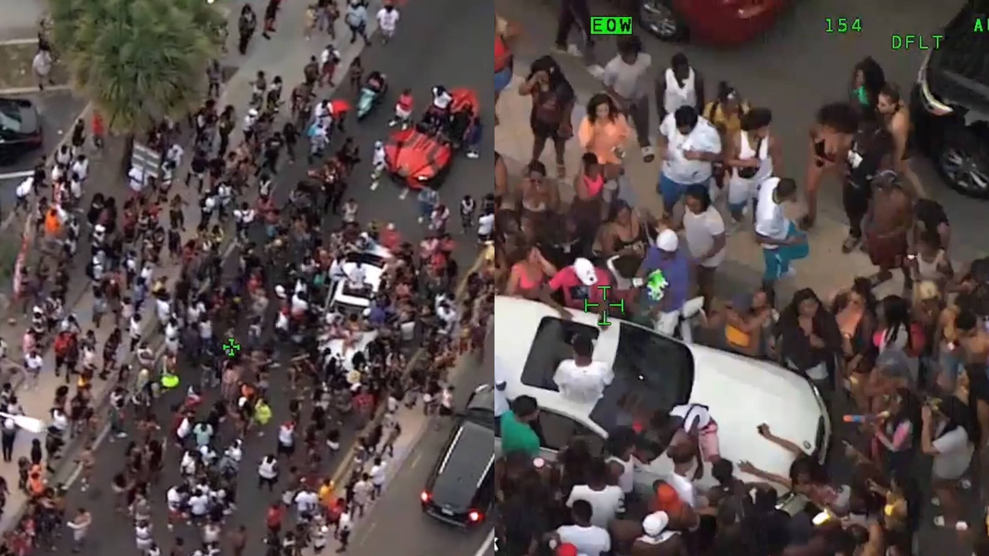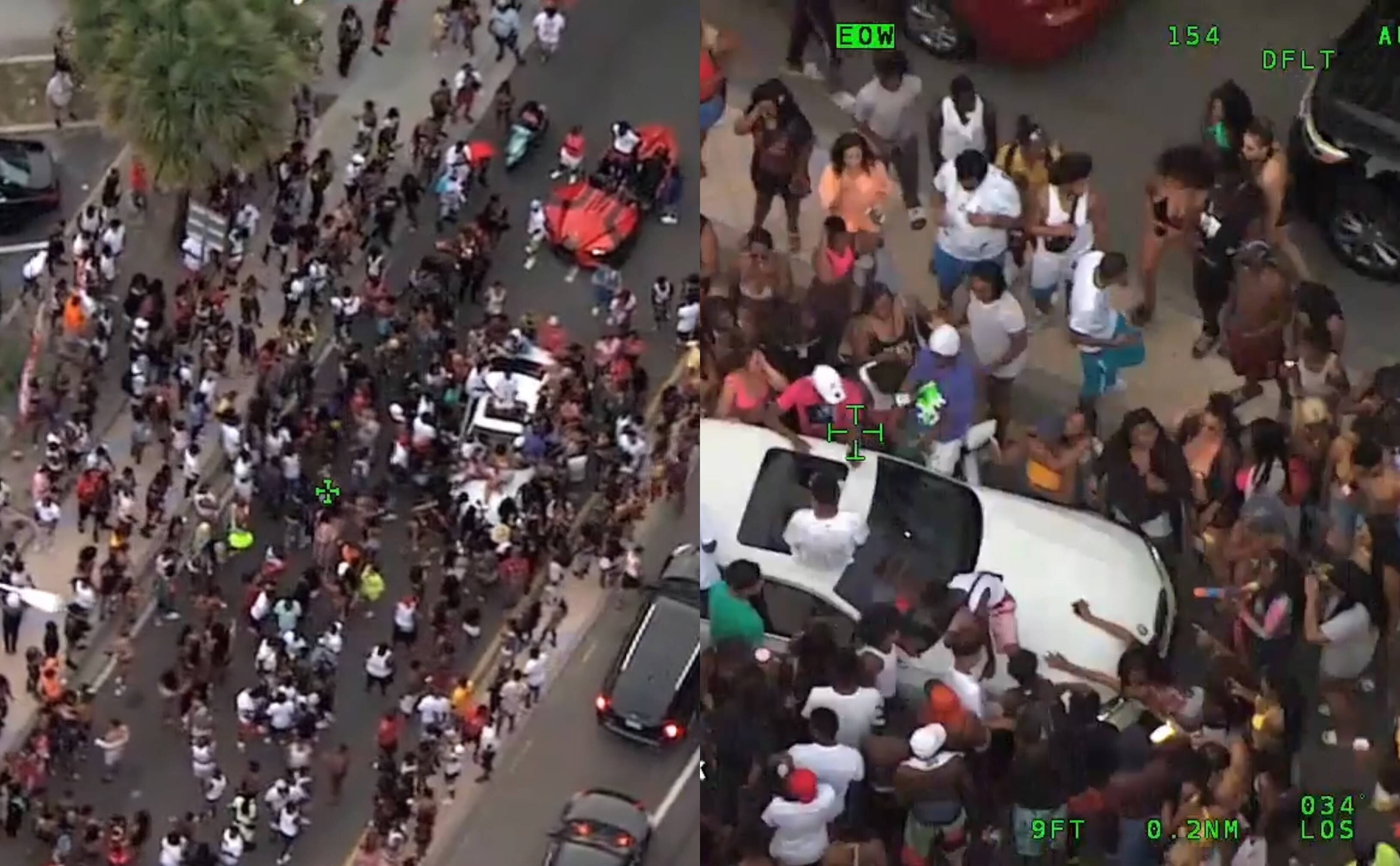 El video compartido en el Facebook de la Policía de Volusia, muestra a una gran cantidad de personas, se presume cerca de 200, bailando y socializando en las calles.