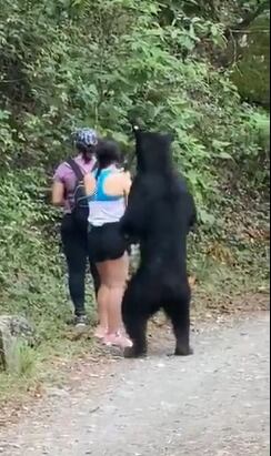 En su caminata por el parque, un oso negro se atravesó en sus caminos. Ellas se quedaron totalmente quietas mientras el oso las olfateaba y examinaba. El video muestra como el oso se para en sus patas traseras para olfatear a una de las mujeres en el área del cuello.