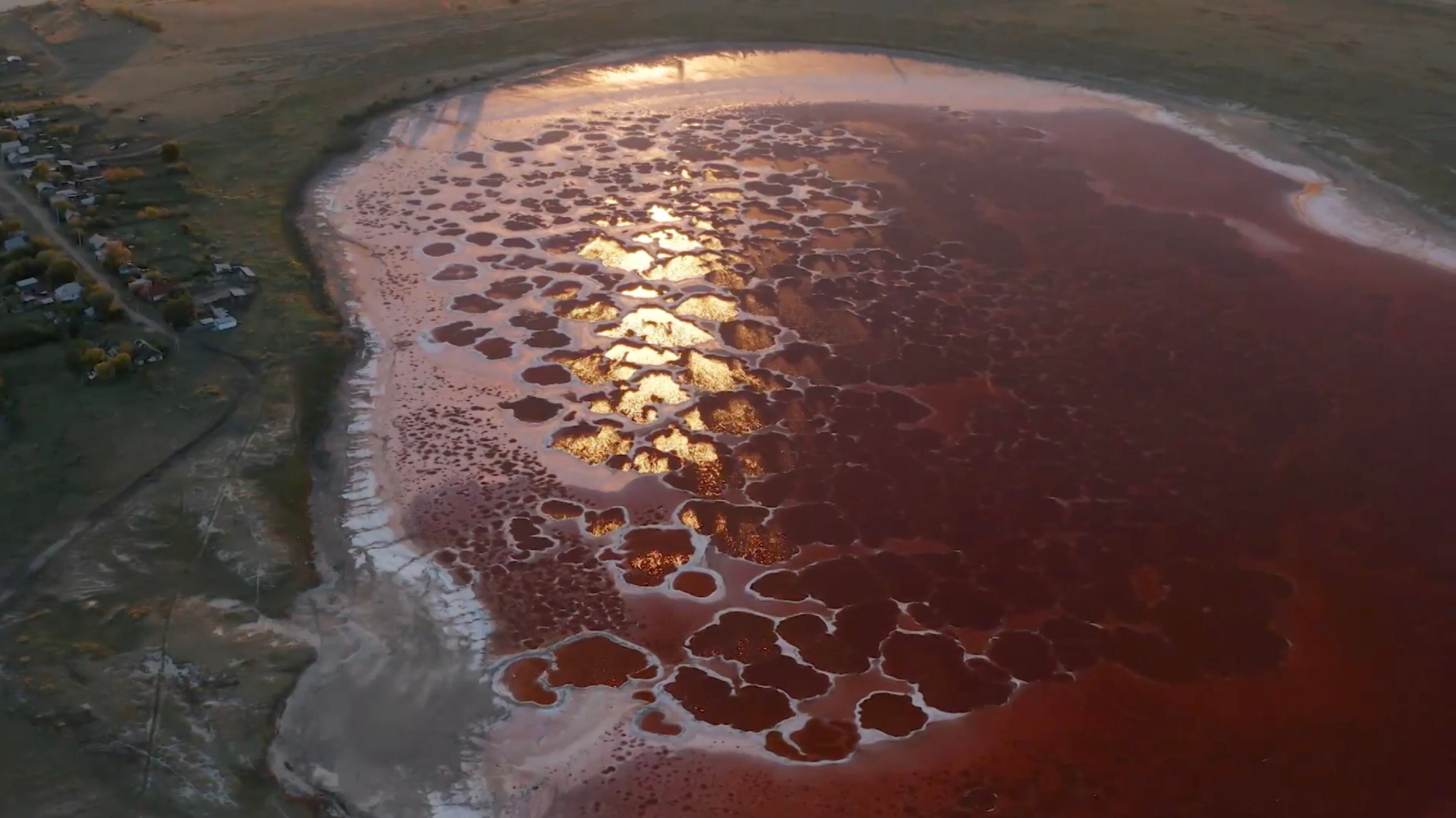 El lago Burlinskoye, en la región de Altai, se tiñe de rojo con el aumento de las temperaturas en verano. El fenómeno provocado por su alta concentración de sales (aproximadamente 253 gramos de sal por litro de agua) y una pequeña especie de camarón de salmuera, llamada Artemia Salina. Cuando el clima es seco y caluroso, este crustáceo libera un pigmento rosado único que brilla según el calor.