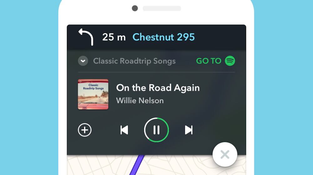 En la pantalla de Spotify también se encuentra el ícono de Waze. Al tocar éste se iniciará el viaje mientras que la música se reproducirá en segundo plano. Se puede volver fácilmente a Spotify con un sólo toque.
