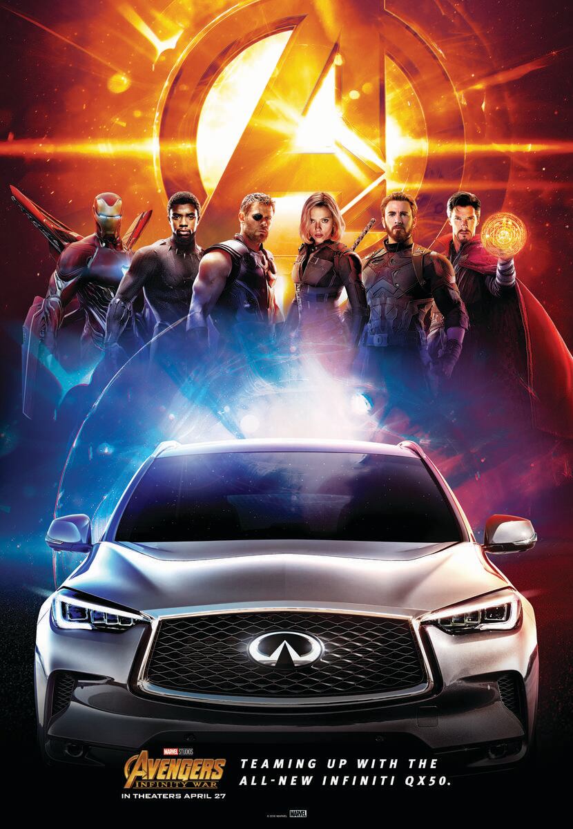 La marca de autos premium Infiniti se asoció con “Avengers: Infinity War” de Marvel Studios para celebrar el lanzamiento del nuevo y lujoso crossover de tamaño mediano, el QX50 2019. Además de poder ver una versión de 90 segundos del anuncio en los cines a partir del 27 de abril, los fanáticos del cine que acudan a ver la película podrán ver el Infiniti QX50 en una escena de “Avengers: Infinity War”.