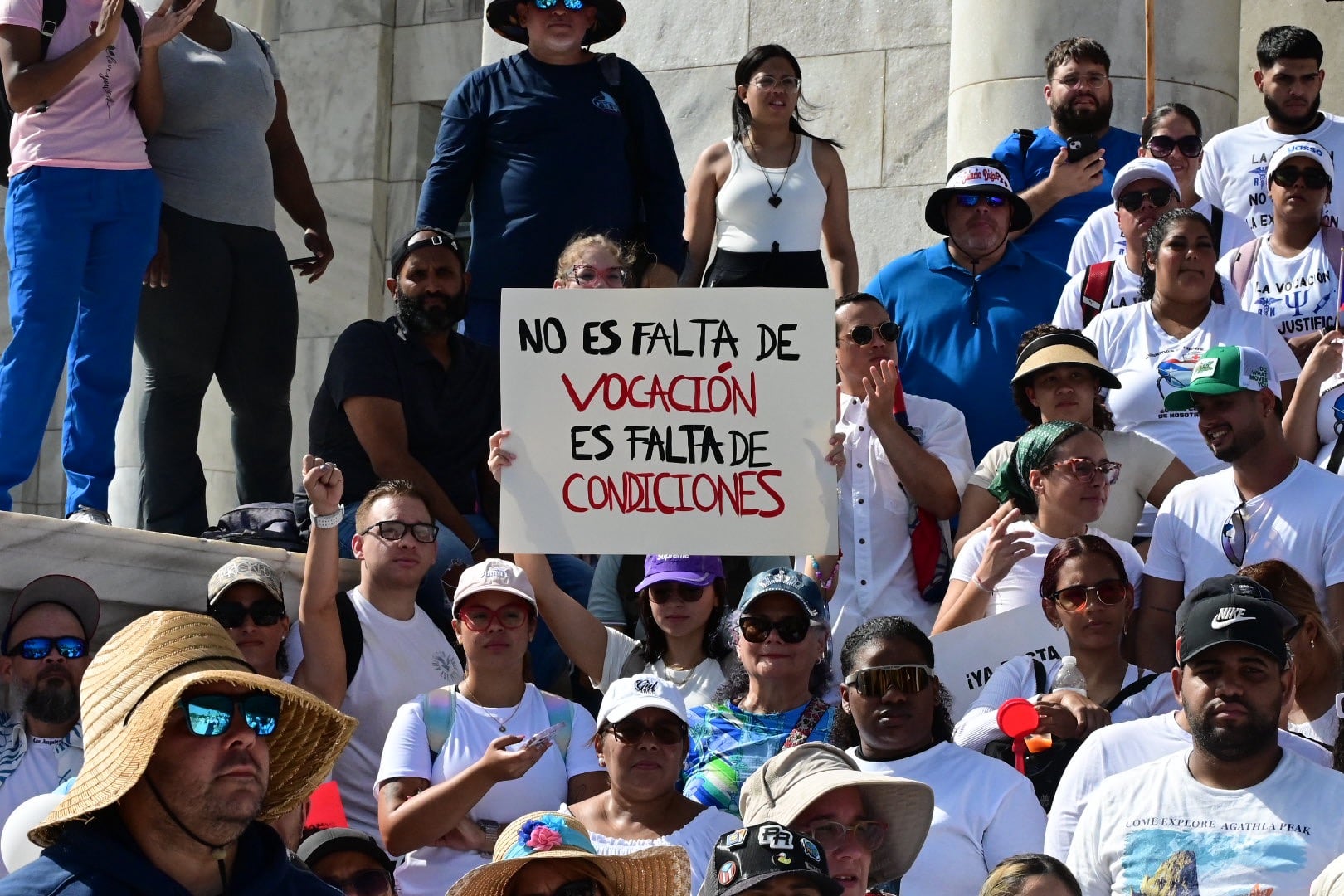 Enfermeros protestan Las enfermeras y enfermeros protestan frente al Capitolio, demandando mejores condiciones de trabajo y salario. Capitolio, San Juan. Metro PR 12 de junio de 2025