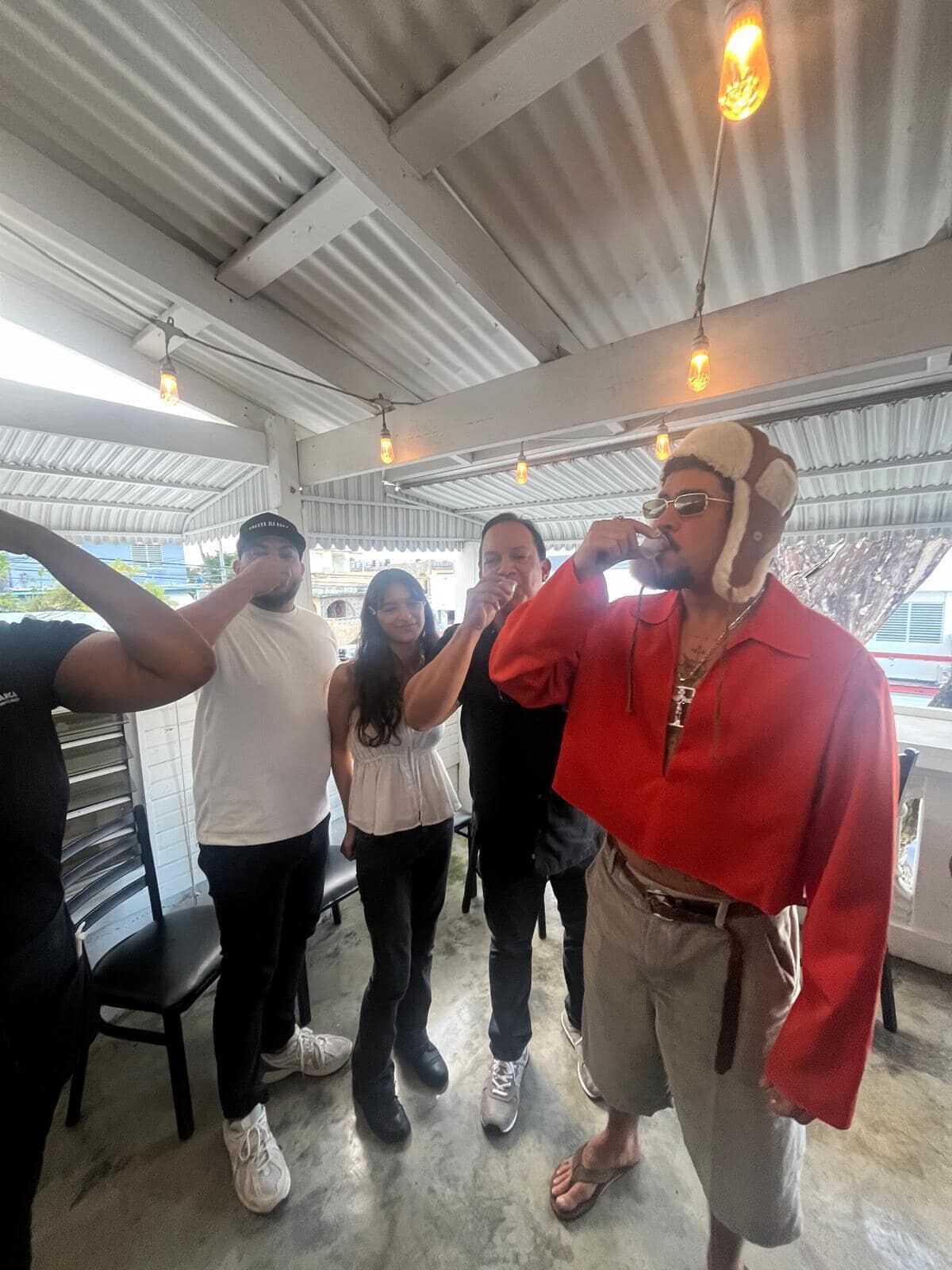Vestido con su estilo característico y chancletas, el creador de Debí tirar más fotos no pasó desapercibido mientras interactuaba con los presentes. Entre risas y fotografías, el intérprete decidió participar en una de las tradiciones más auténticas de la cultura puertorriqueña: brindar con un shot de pitorro, la popular bebida artesanal de la isla.