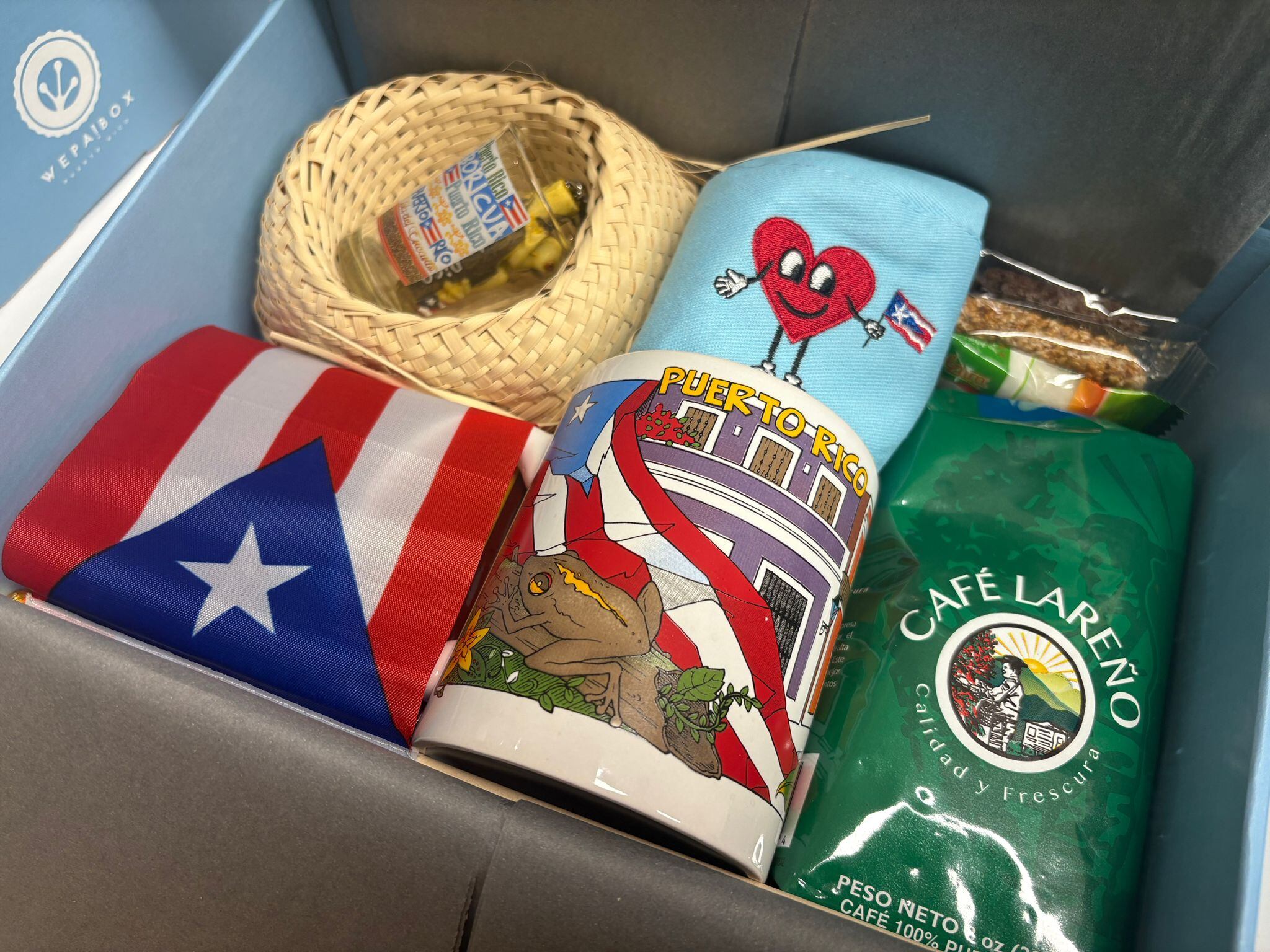 Uno de los elementos más distintivos es un libro de historia del Instituto de Cultura Puertorriqueña, que convierte esta caja en una herramienta de aprendizaje y afirmación cultural. A esto se suman una bandera de Puerto Rico, un sombrero estilo “PR Love”, dulces típicos, pasta de guayaba y más delicias y recuerdos que apelan al corazón.