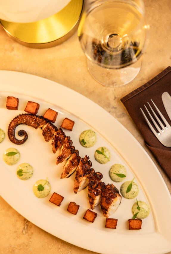 La experiencia comienza con una sedosa velouté de habichuelas blancas con emulsión de aceite de trufa y crujientes de pana, uno de los platos insignia del chef. Entre los aperitivos más destacados figuran la cazuela de escargot en hojaldre con salsa de coñac, el delicado foie gras a la plancha sobre plátanos dulces y cebolla caramelizada, y el tartare de filete mignon acompañado de fritas de pana y salsa gribiche de trufa. También sobresale el pulpo marinado con alioli de cilantro, y el pastel de langosta con alioli de azafrán.