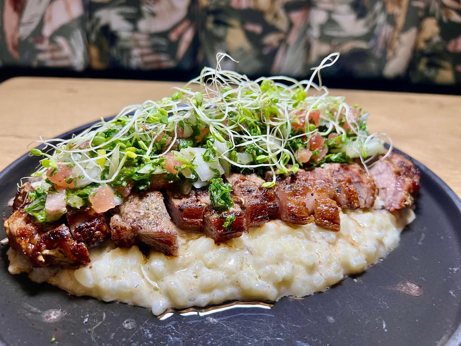 Para abrir el apetito, los tostones de chicharrón con crema de aguacate criollo y kimchi mayo son irresistibles, al igual que el hummus de remolacha, servido con piñones tostados, queso fresco y aceite de oliva.