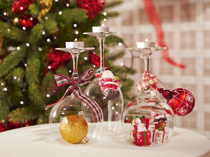 Pinterest Decoración con copas y adornos de Navidad.
