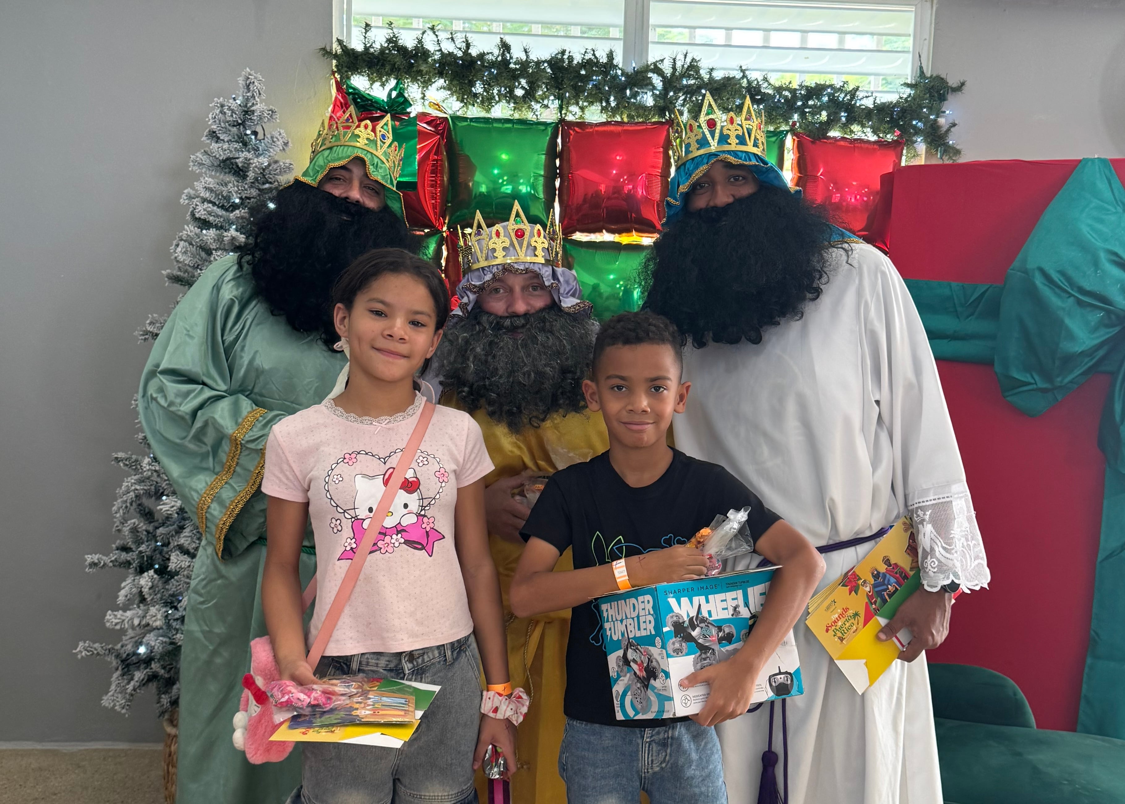 Rodríguez, Domínguez y Roberto Soto del Cueto —cuarto socio principal de la empresa— representaron a los Tres Reyes Magos durante la actividad titulada ‘Compartiendo Amor’, iniciativa que surgió tras conversaciones entre Yadiel Carrasco y Karla Andrea, conductor y productora del podcast NPTE, junto al equipo administrativo de Pasta to go.
