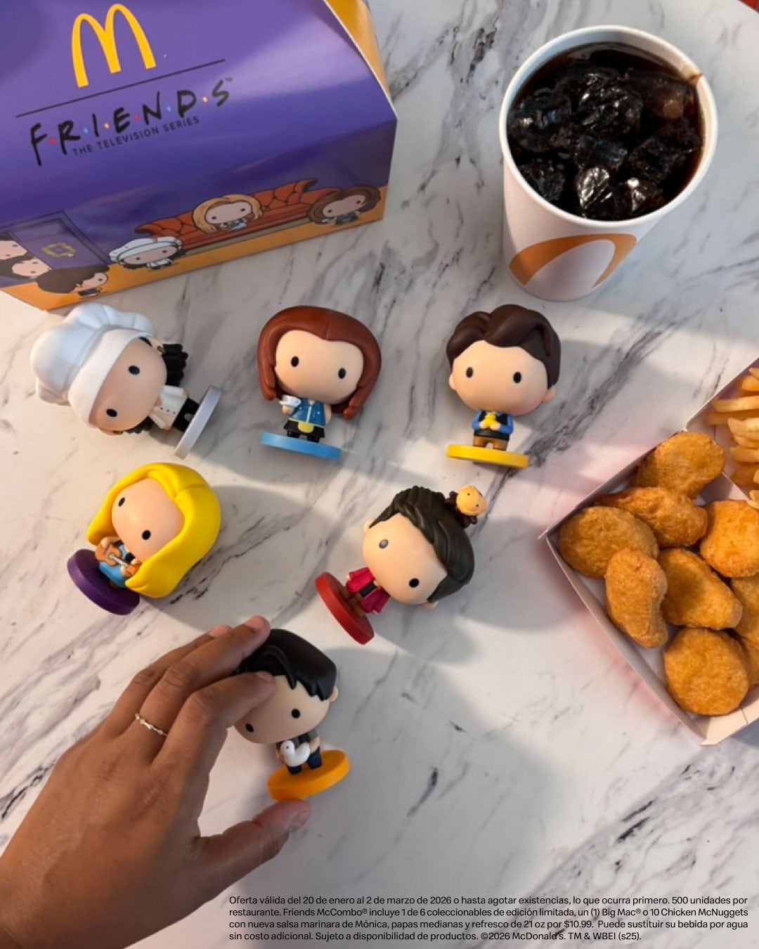 La propuesta incluye una figura coleccionable inspirada en uno de los seis personajes principales y ofrece la opción de escoger entre un Big Mac o diez piezas de Chicken McNuggets, en tamaño mediano. Como guiño directo a uno de los momentos más recordados del grupo, el combo se acompaña de la salsa Marinara de Mónica.