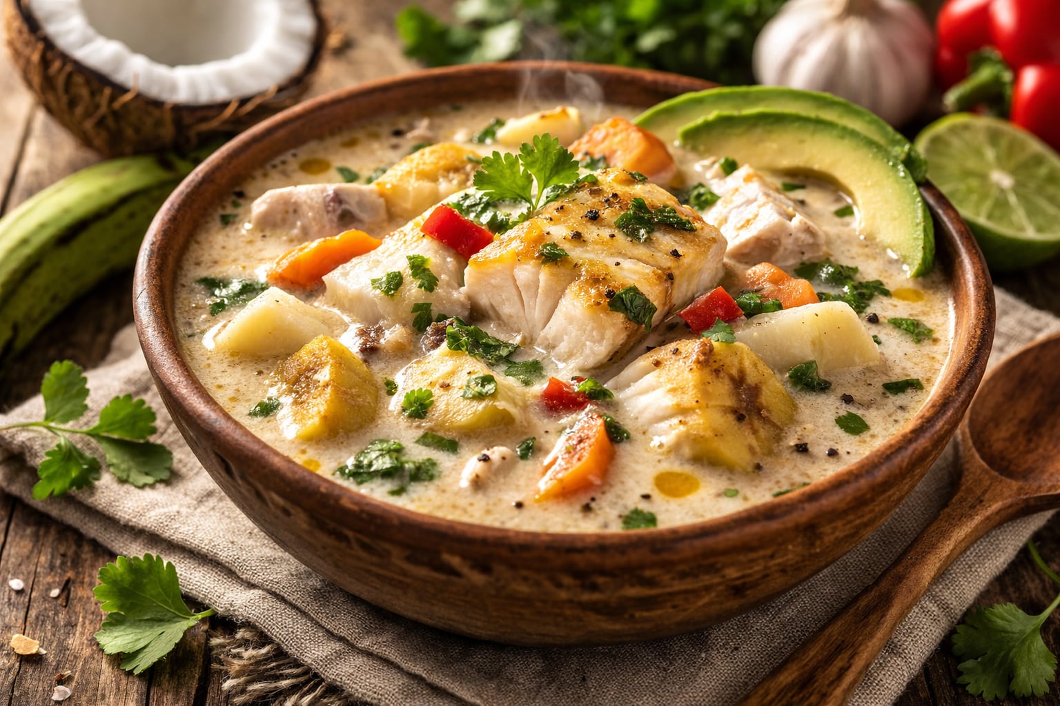 Mientras las viandas se cocinan, el siguiente paso es integrar la leche de coco, que le da al caldo santo esa personalidad tan distintiva. Lo ideal es añadirla cuando las viandas ya estén suavizando, para que se mezcle con el almidón natural y cree una consistencia sedosa. En este punto también puedes ajustar con sal, pimienta y una pizca de jengibre fresco si deseas un toque más aromático.