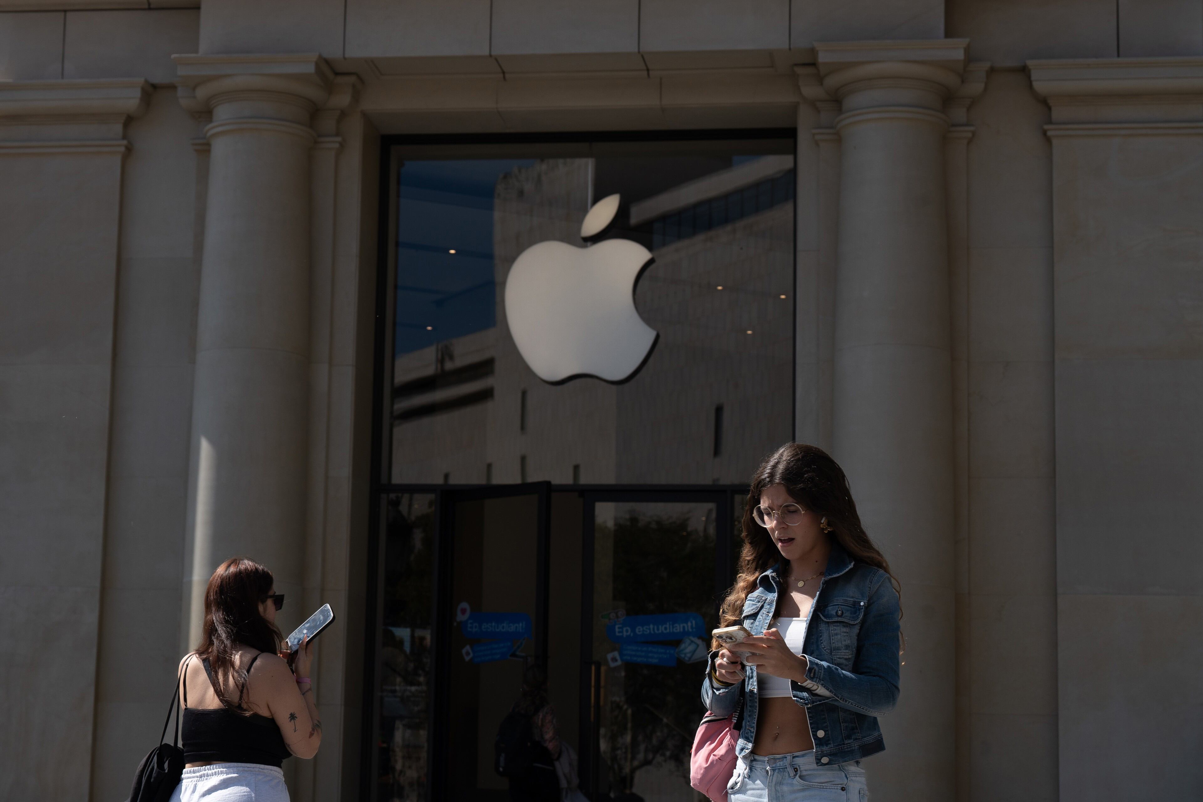 Varias personas pasan junto a una tienda de Apple, a 16 de septiembre de 2024, en Barcelona, Catalunya (España). Apple ha aumentado el precio de su servicio de reparación de baterías para los nuevos iPhone 16 Pro y 16 Pro Max, que costarán un 24 por c David Zorrakino - Europa Press (David Zorrakino - Europa Press/Europa Press)